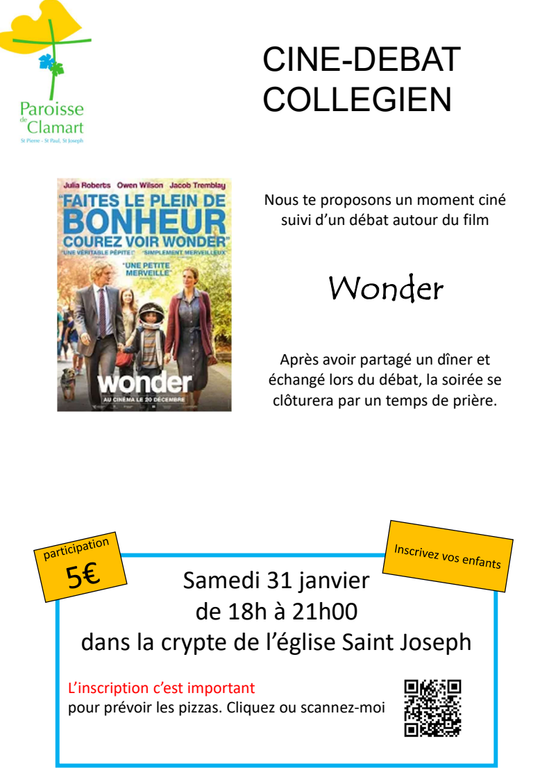 Nous invitons les collégiens à venir découvrir le film Wonder. Après un dîner, séance de partage sur les différentes thématiques du film.
